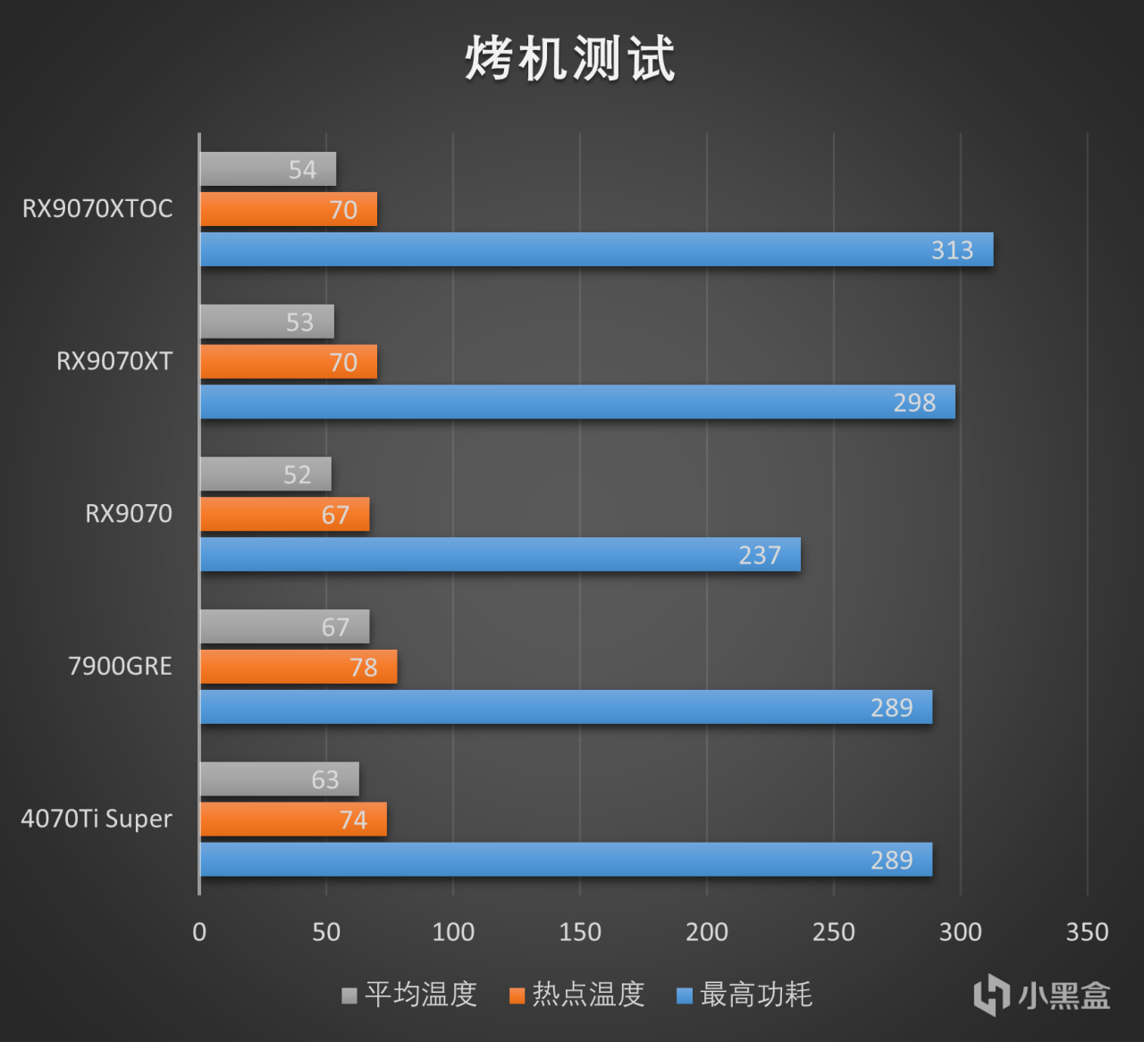 而在烤機測試上,RX 9070XT和9070表現也非常不錯,因爲藍寶石的散熱一直都是超規設計,這一次首發的兩張卡的散熱器熱設計功耗基本能達到400W,面對不到300W的兩張新卡,散熱壓制可謂是非常輕鬆。RX9070XT烤機平均溫度53℃,熱點70℃,即使超頻之後也只有54℃的平均溫度,而RX9070 只有52/67℃,兩張卡顯存溫度控制在了80℃以下,也是得益於藍寶石覆蓋了顯存的散熱器