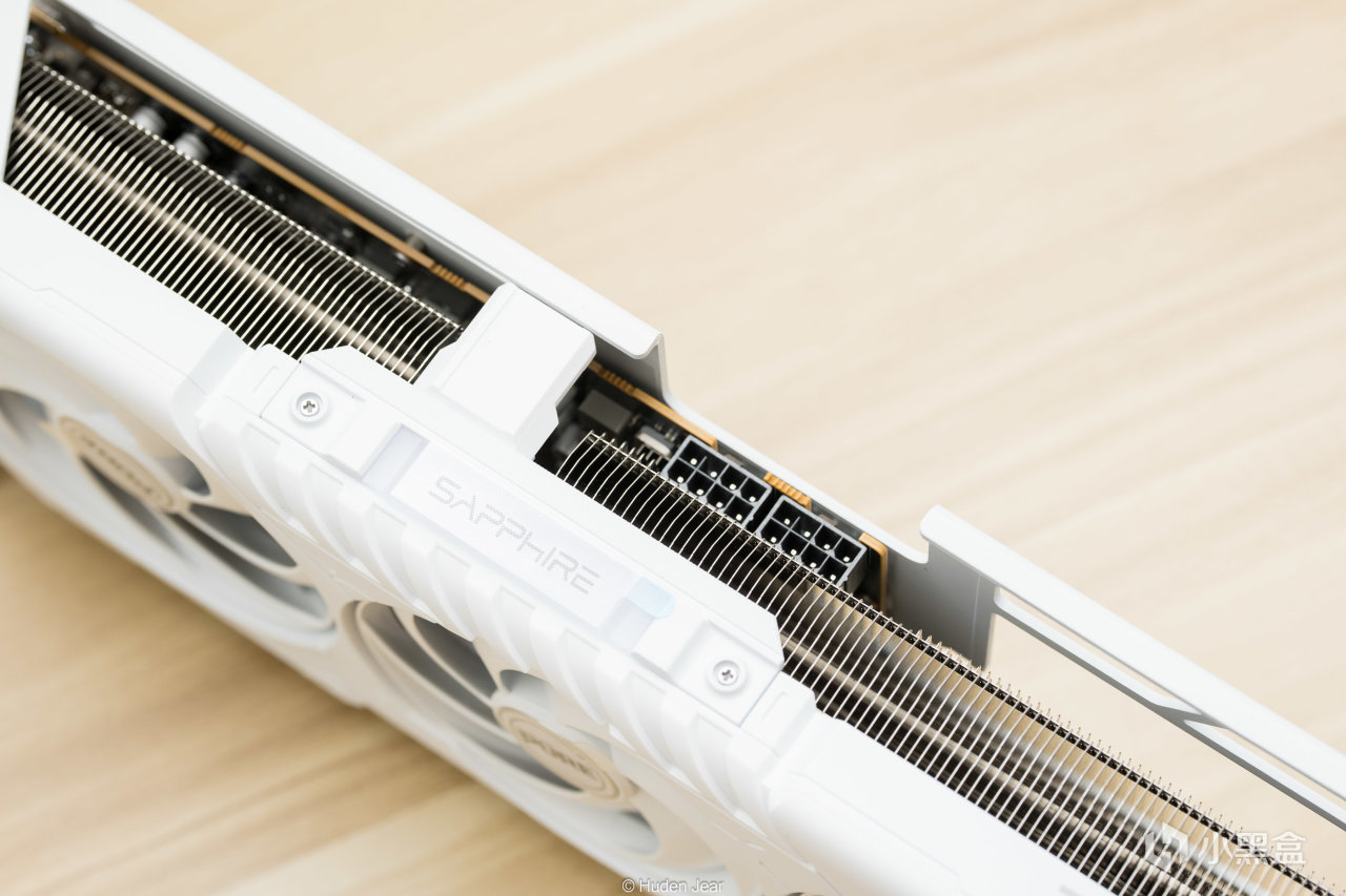 顯卡的背板則使用金屬材質,表面做了陽極氧化和白漆,有AMD的logo和藍寶石Pure的標誌。背板的設計我覺得是相當不錯的,在覆蓋了顯卡CPB的同時正好露出電源接口和ARGB接口,同時在風扇出風的位置又做了鏤空,兼顧保護和散熱,造型和紋飾還好看