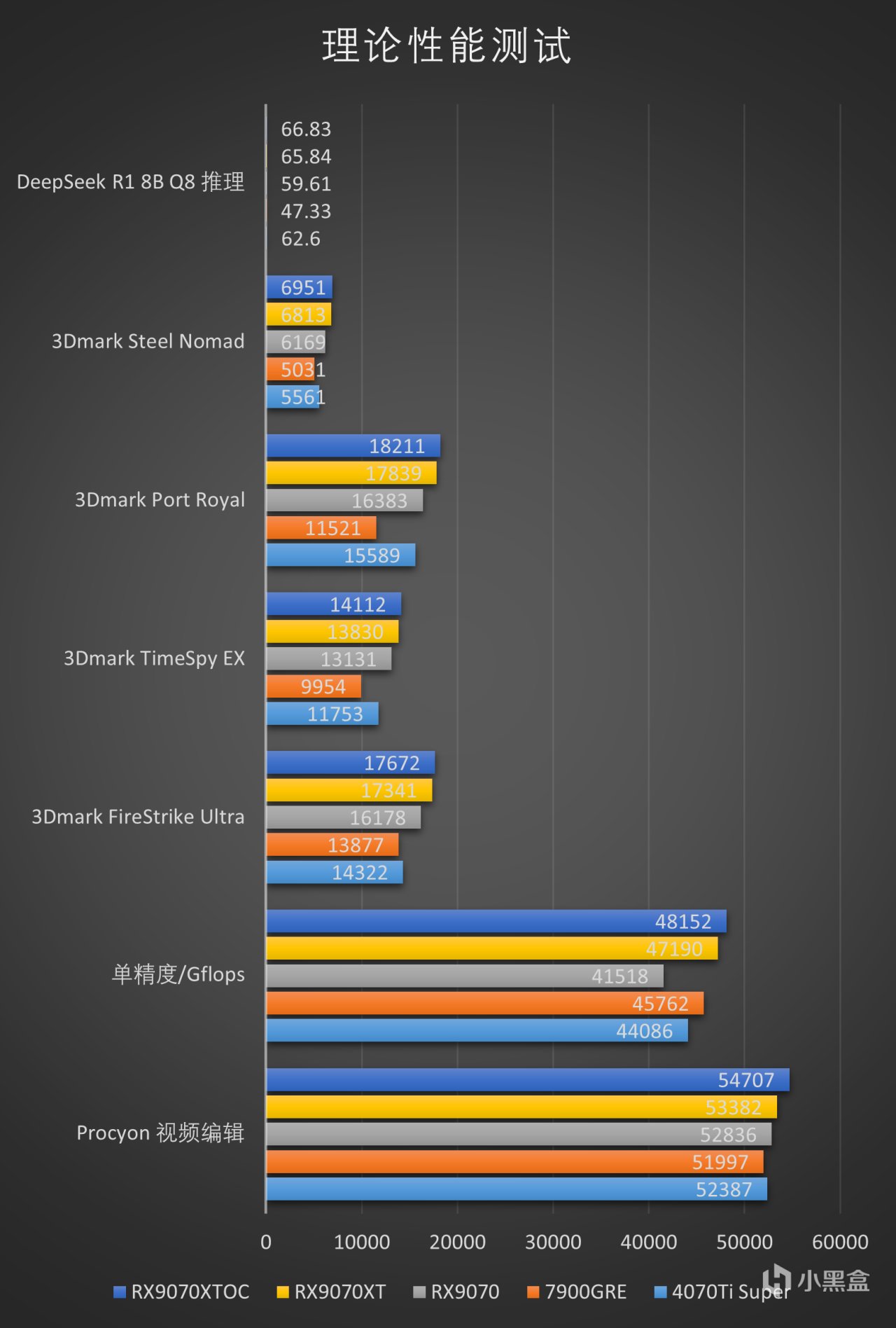 理論性能測試中,RX 9070XT和9070的理論性能爆殺了AMD自家上代16GB的7900GRE,以及Nv家的RTX4070Ti Super,而且RX 9070XT還能再OC,和已經出廠灰燼的上代卡或者4070TiS還不太一樣,尤其是9070,默認功耗低,自帶不少超頻潛力。單從跑分上來說RX 9070就能超過4070TiS,但是總體單精度稍微低一點。這兩仗顯卡也是利用了新構架高效的優勢,性能利用更爲充分。而在大預言模型推理測試上,RX 9070XT和9070用DeepseekR1 8B Q8量化模型都能跑出60tps或以上的成績,生成非常快