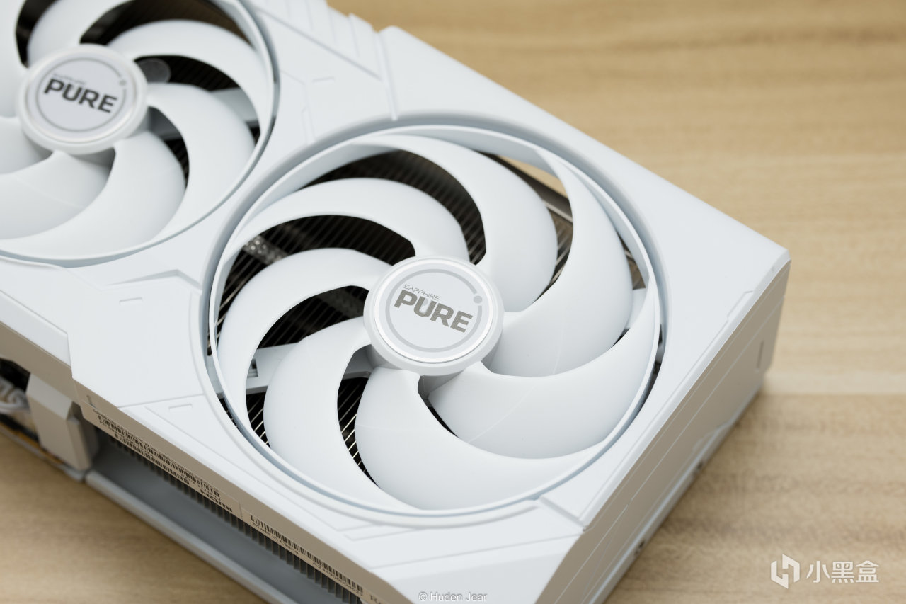 顯卡爲三風扇散熱,軸承是雙滾珠的可以降低噪音,扇葉方向相互間隔着排列。外殼使用塑料材質,尾部有金屬固定,造型設計非常硬朗。風扇上有Pure的logo,從以往的非公來看應該也是定製的AeroCurve顯卡扇葉