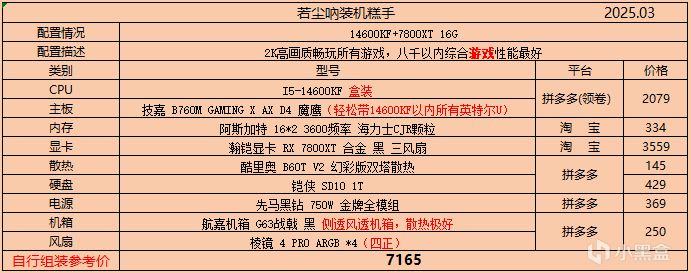 五、7000-8000價位,這個價位,目前因爲顯卡原因,我就不過多列舉配置單,這裏只展示二種不同類型搭配,有需要的盒友可借鑑: