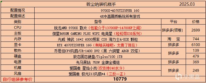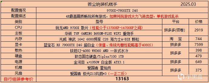 其次就是AMD這邊,首當其衝是不當U的5700X3D,我推了大半年,終究是給它推漲價了,猛漲三四百,已經被我踢出配置推薦行列,低預算玩網遊目前就只推薦12600KF了,搭配D4主板和內存,性價比還是可以的,9600X、9700X、9950X目前價格穩定,其中9700X性能價格都非常不錯,在八千以上預算中,其卓越的性價比幾乎無可企及,無論是網遊還是單機遊戲能力都非常強,目前力薦;