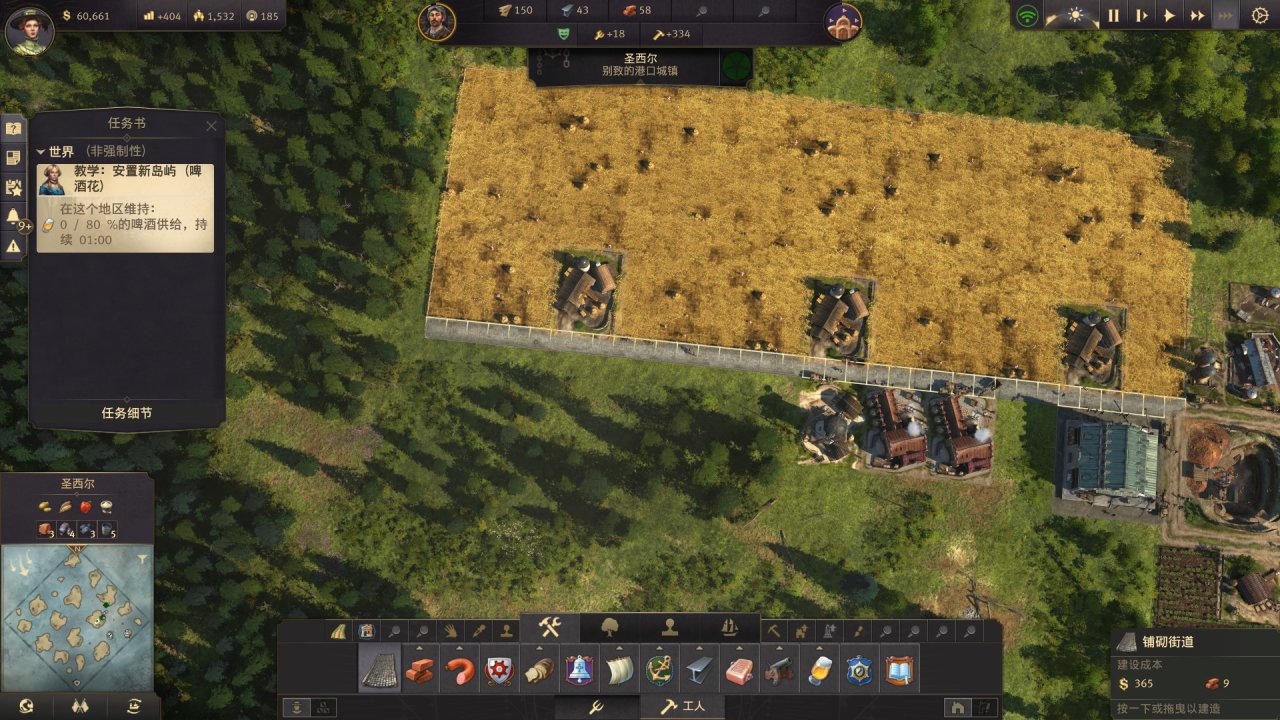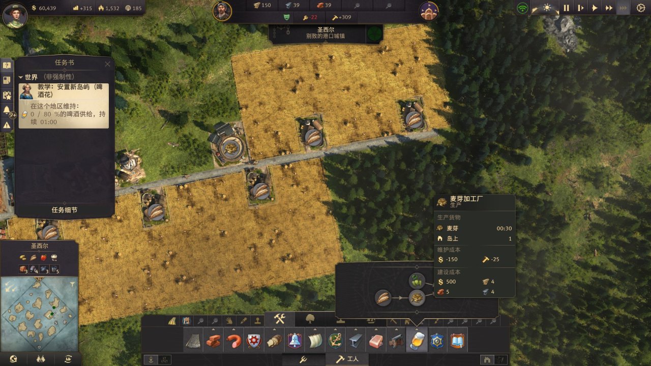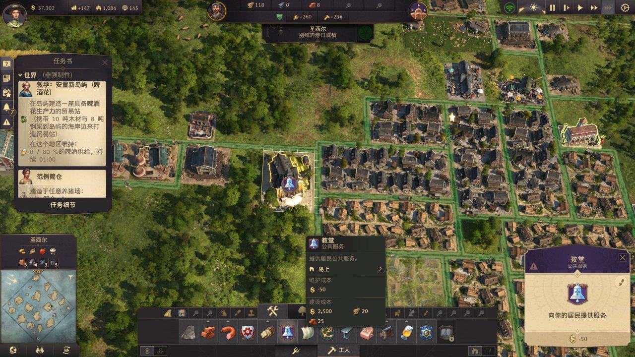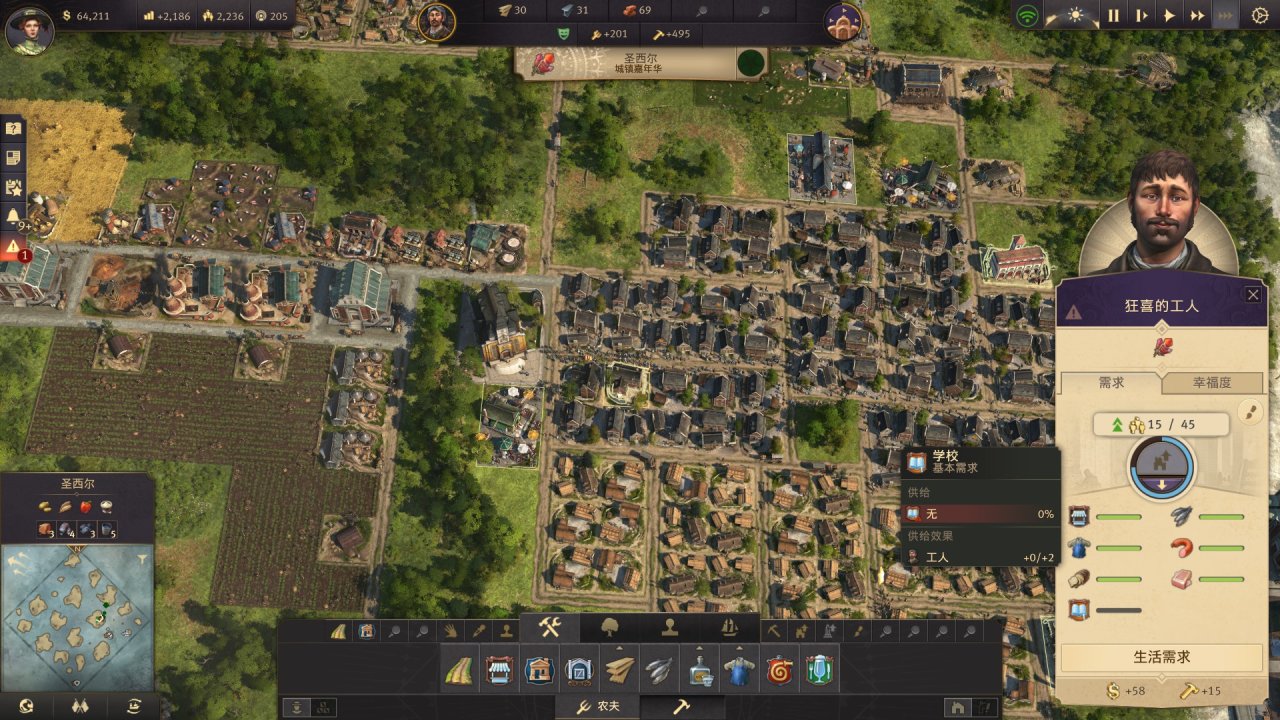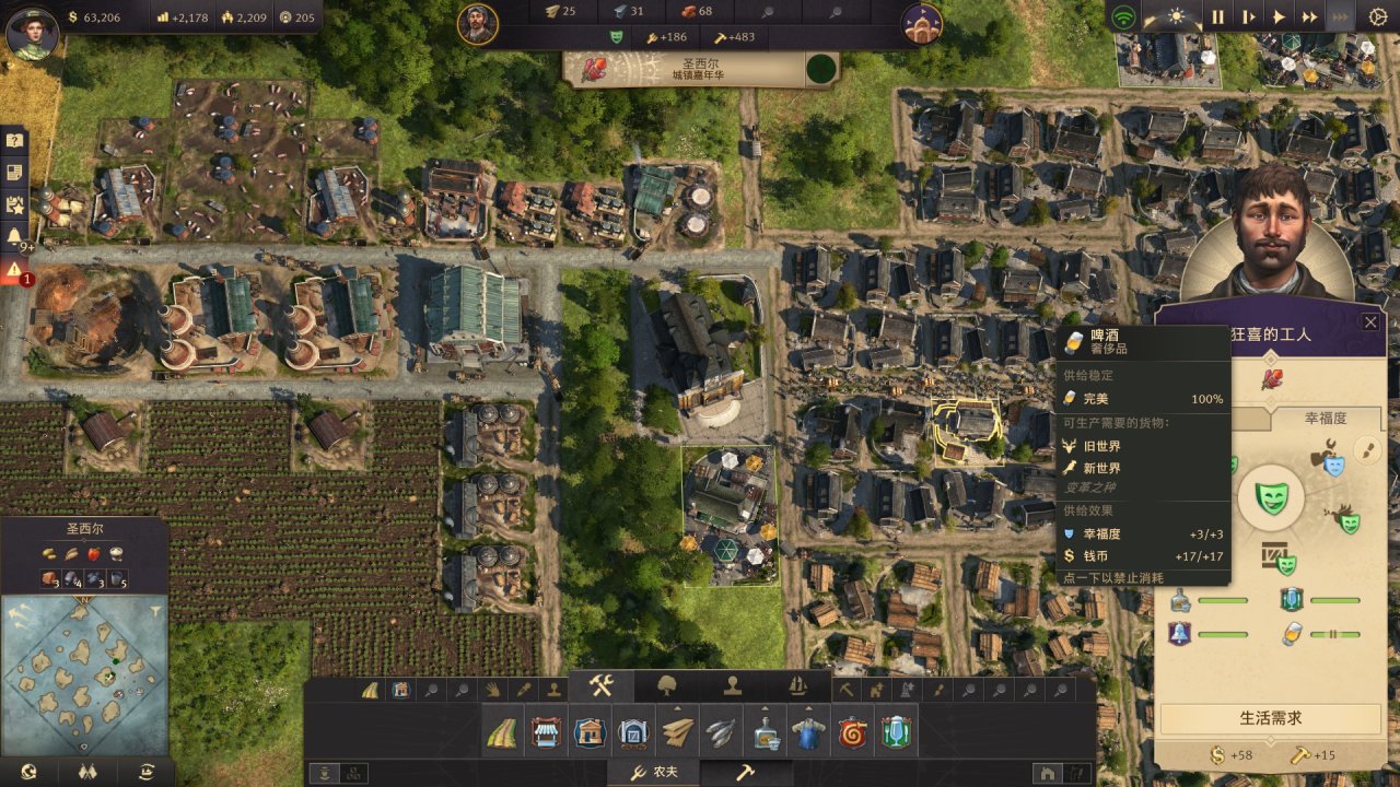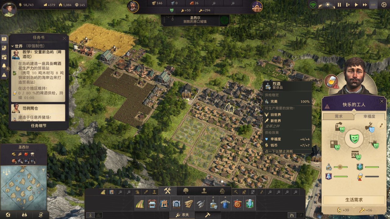 這時候我們看一下居民的幸福度需求,發現還缺烈酒、教堂、啤酒,安排!