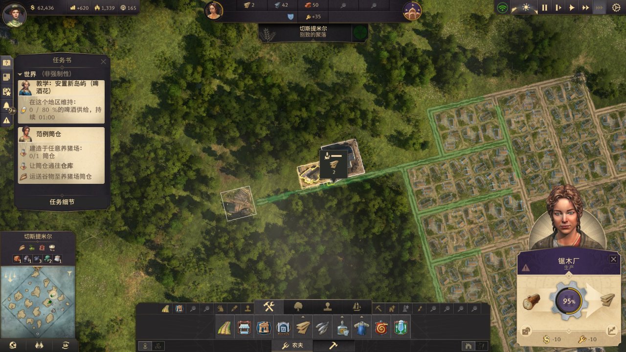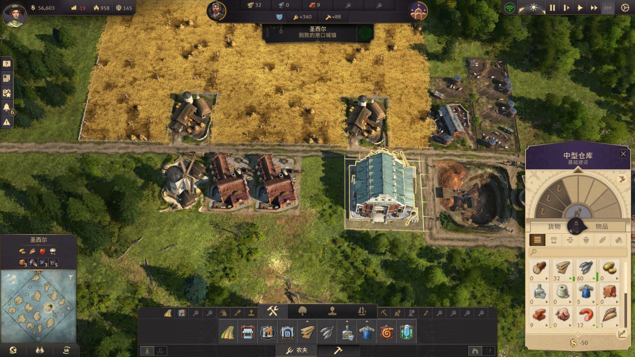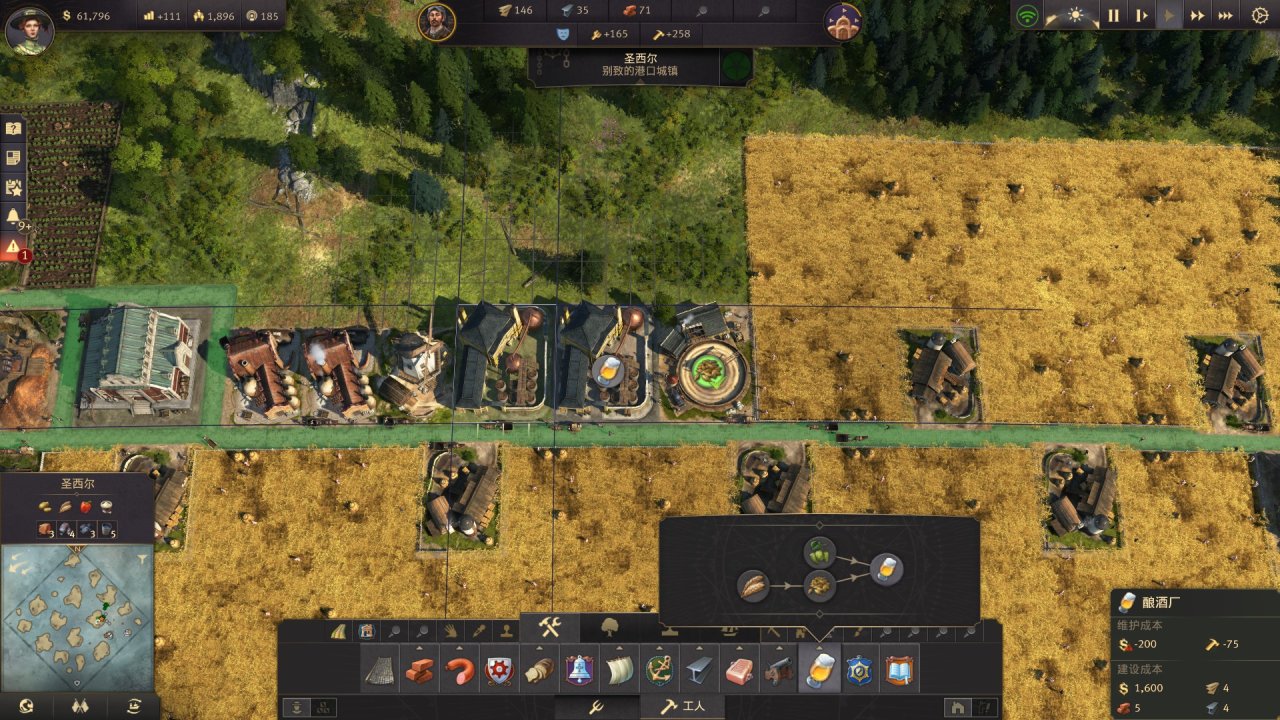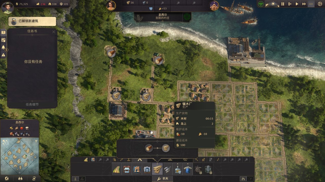 開局建一個漁場,兩個伐木場和兩個鋸木廠,以一比一的比例建造,在旁邊再安個倉庫。