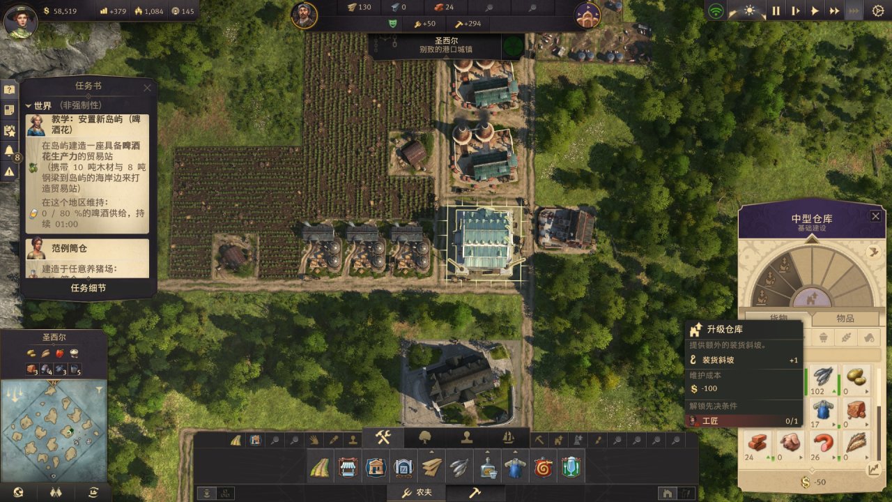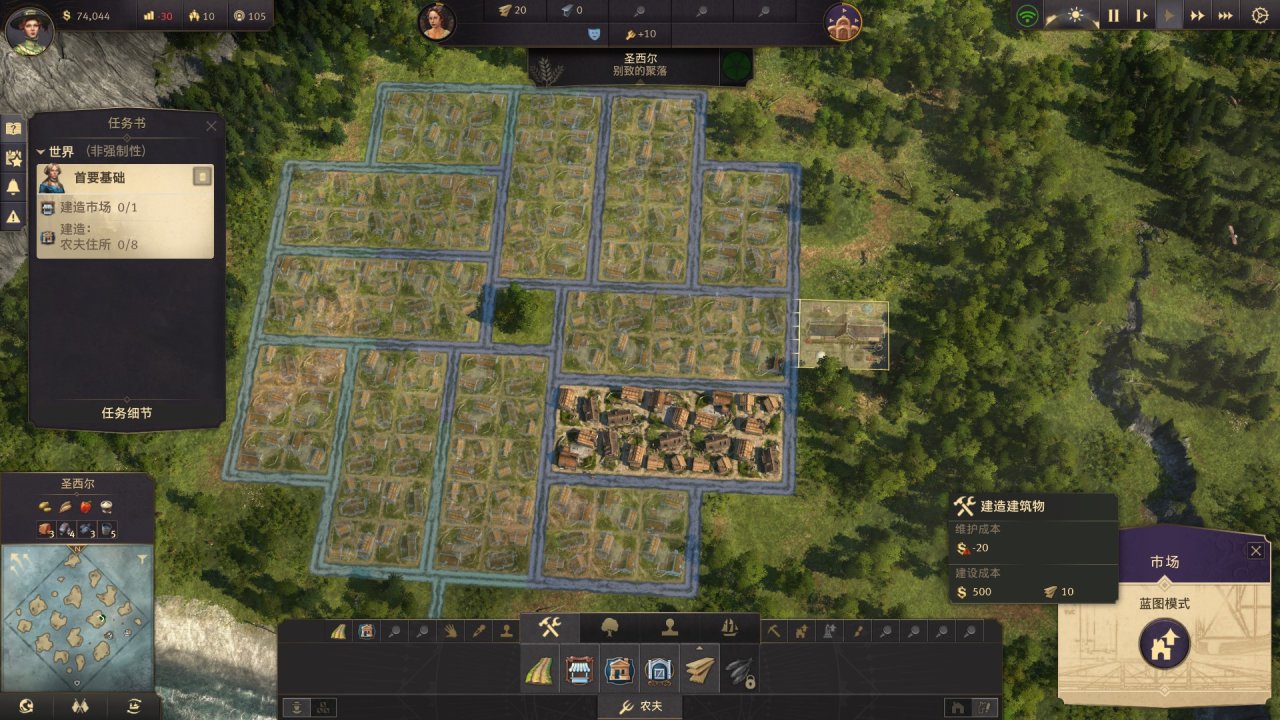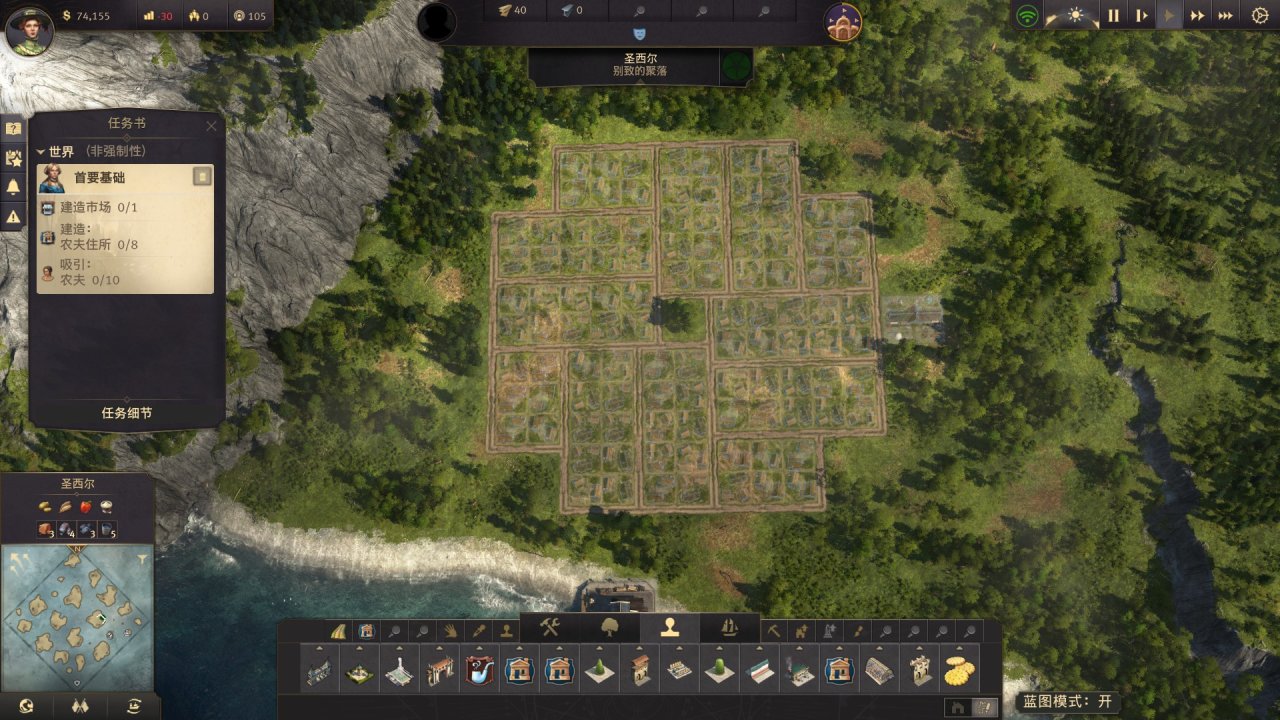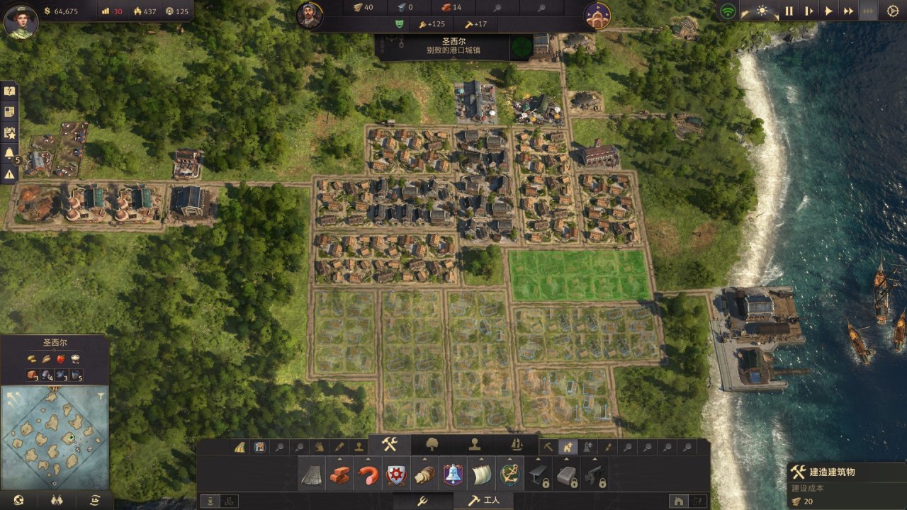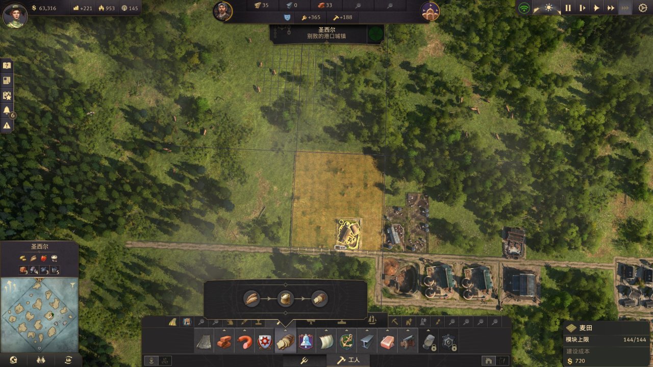 開局建一個漁場,兩個伐木場和兩個鋸木廠,以一比一的比例建造,在旁邊再安個倉庫。
