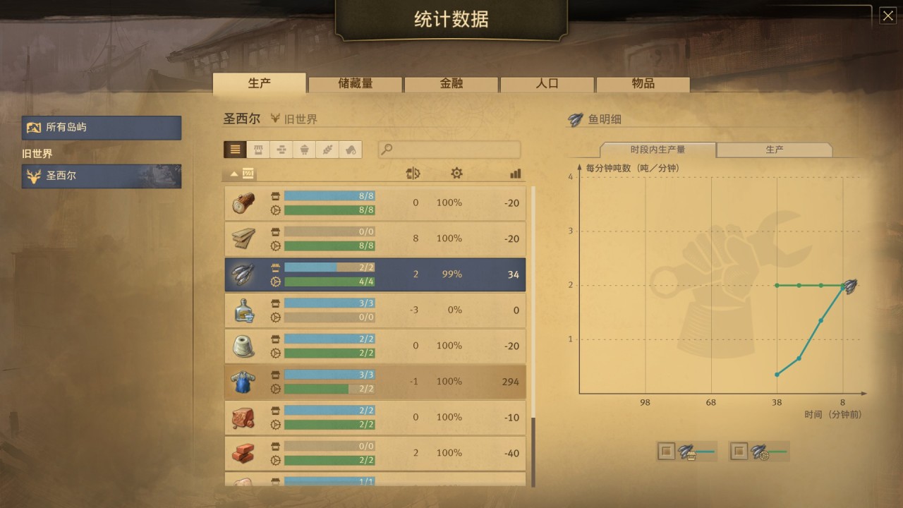 可以在這裏看見魚的需求大於供應,藍條代表每分鐘的需求量,綠條代表每分鐘的供應量。