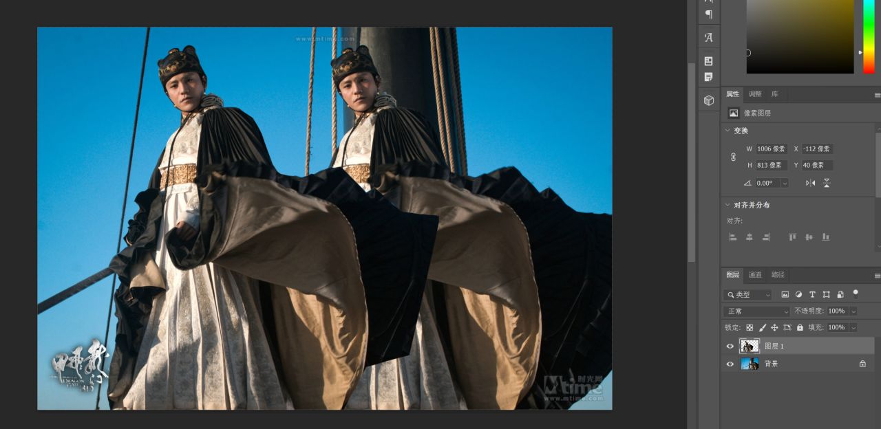 拼接完后,可以看出,有些地方色差太大了(有点假)这个时候即可调整图层的混合模式和