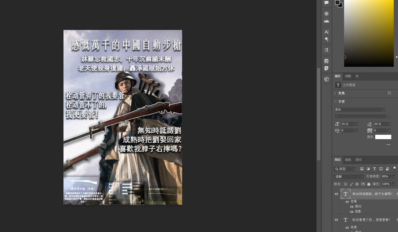 “文字”按“T”选择横排文字工具,然后就开始打字吧,排版也可以参考一些著名海报的。(自己开心就好,随便怎么样都行)