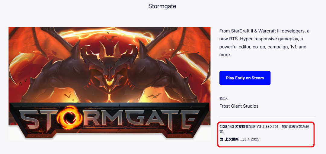 尽管从《地狱之门:伦敦》开始,一边脱离大厂另立门户、一边用大厂履历拉大旗做宣发的作品基本都没有好下场,但架不住当时的RTS市场确实亟需那么一匹黑马来一扫颓势——于是,在2023年12月开启众筹之后,仅仅过去15分钟,最开始的目标金额就被顺利突破,随后更在极短的时间内达成了2300%的醒目成绩——考虑到初始目标仅仅是10万美元,我们很难不把这次众筹视作一场标准的营销活动,但从热火朝天的玩家支持率来看,“即时战略游戏”乃至“暴雪式RTS”在彼时彼刻拥有不俗的人望,显然是不争的事实。