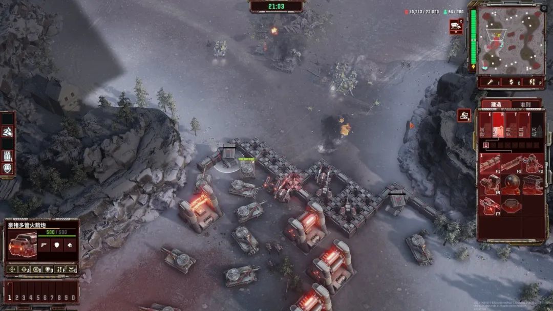 不仅如此,和大多数流于表面的模仿不同,实际上手一试便知,《风暴崛起》对于《命令与征服》乃至C&C Like这个RTS品类的复刻,要比想象中来得更深入——围绕地图中立建筑的占据与清剿不用多提,空投控制信标在前线创造临时防线的操作也算耳熟能详,能够有效吸收炮火伤害并分割战场的围墙也算是保留节目,在此之上能够直接轰击特定预期制造杀伤箱(Kill Box)的远程火炮,属实让从《命令与征服2》一路玩到今天的老玩家感动了一把:以上这些要素叠加在一起,为《风暴崛起》带来了硬桥硬马的纵深战场构筑体验,这种凭借优势火力徐徐推进战线直到彻底碾碎敌人的快感,正是C&C RTS真正的醍醐味所在。