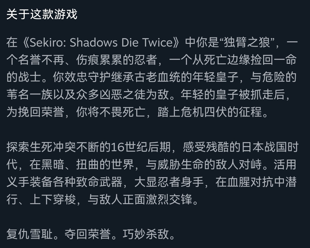 大家好,今天Steam有相當多的遊戲都迎來了折扣,不知道的還以爲這些是搶跑春促,其中《只狼:影逝二度》更是迎來了史低,這是一款很讓人驚豔的遊戲,不僅僅是因爲它只有14個G的大小,而且它質量很好,助宮崎英高先生拿下了第一座TGA年度大獎。