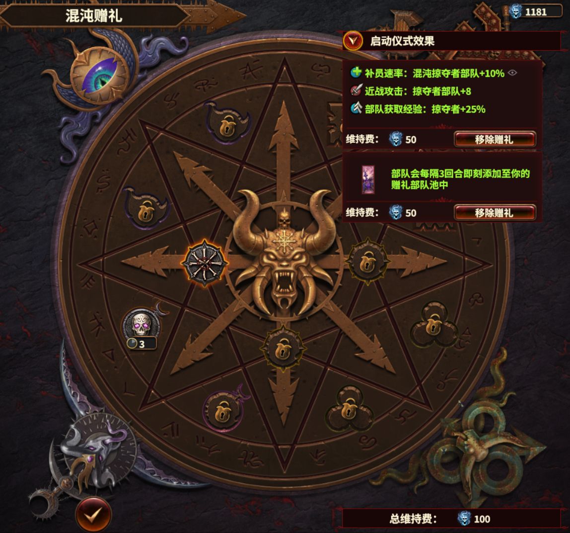 建议「混勇步兵」升重武;「色孽步兵」升长鞭;色孽骑兵可以不需要,直接上战车,再加几个狗子和飞妖。