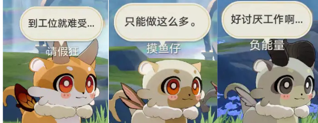 活動內容我們瞭解了,那爲何會有這麼多玩家“破防”呢?其實從上面這些小奇美拉的名字,可能有人已經看出端倪了。活動裏面藏了很多與打工人相關的梗,比如這幾位的吐槽,哪個社畜沒有在工作累到不行時和朋友抱怨過這些話呢?