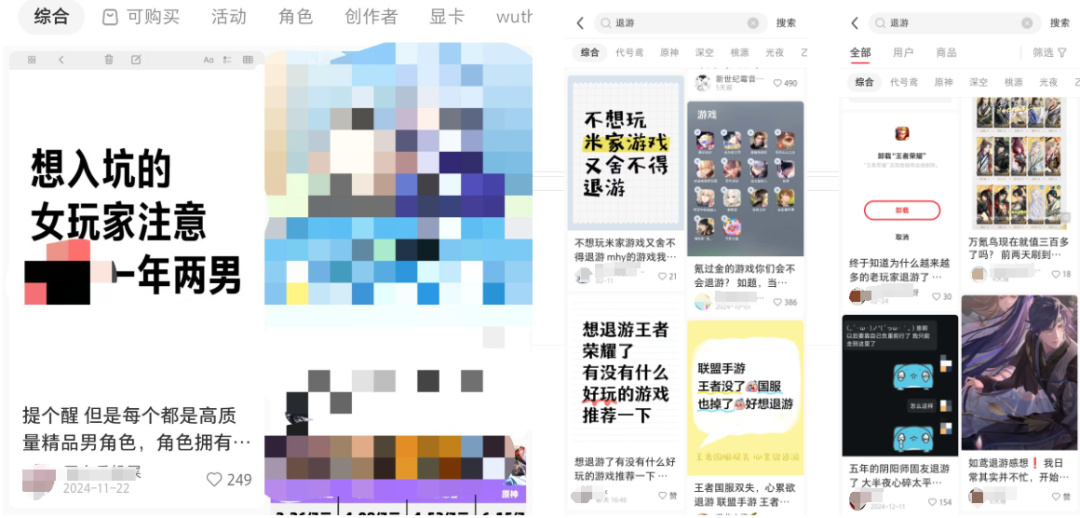 在小紅書,新遊戲搜索結果靠前的往往是“巨坑,快跑”等負面內容和退坑原因。
