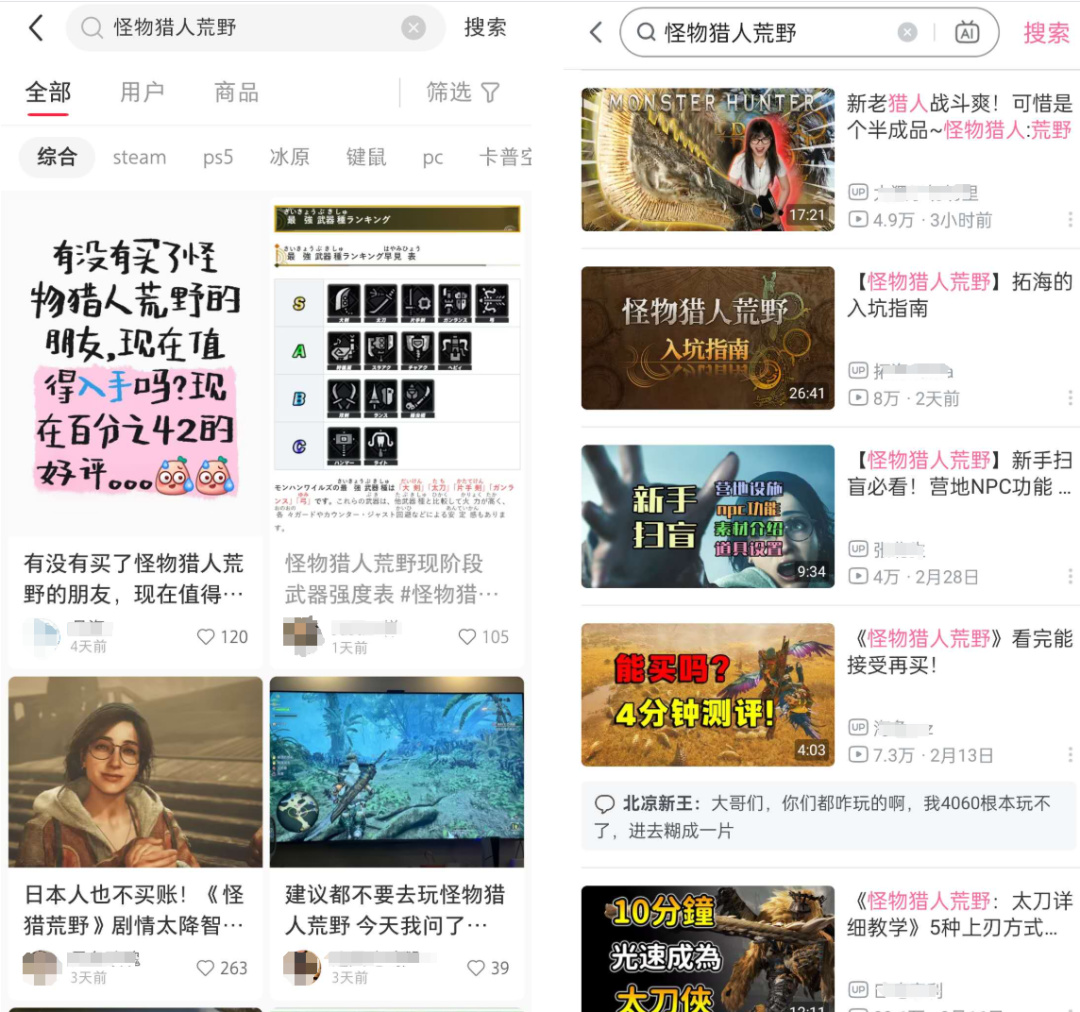 比如最近上線的《怪物獵人荒野》,B站靠前的都是攻略向的教學指南,而小紅書靠前的都是“該不該買”、“不推薦入坑”等主觀情緒向評價。