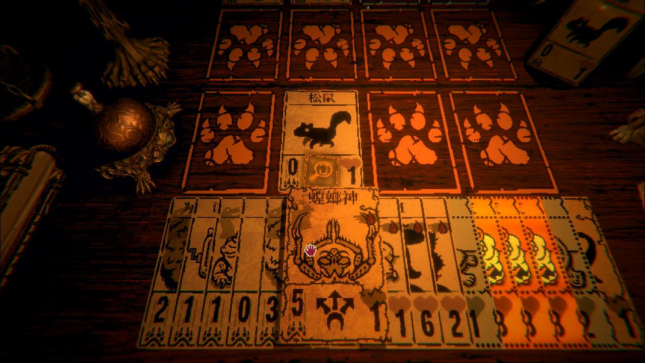 當你坐定,對面的男人便開始向你講述遊戲的規則,你手中有兩種牌,一種是隻供獻祭用的松鼠,另一種則是帶有攻擊力的動物牌,比如3點攻擊力2點血的狼。