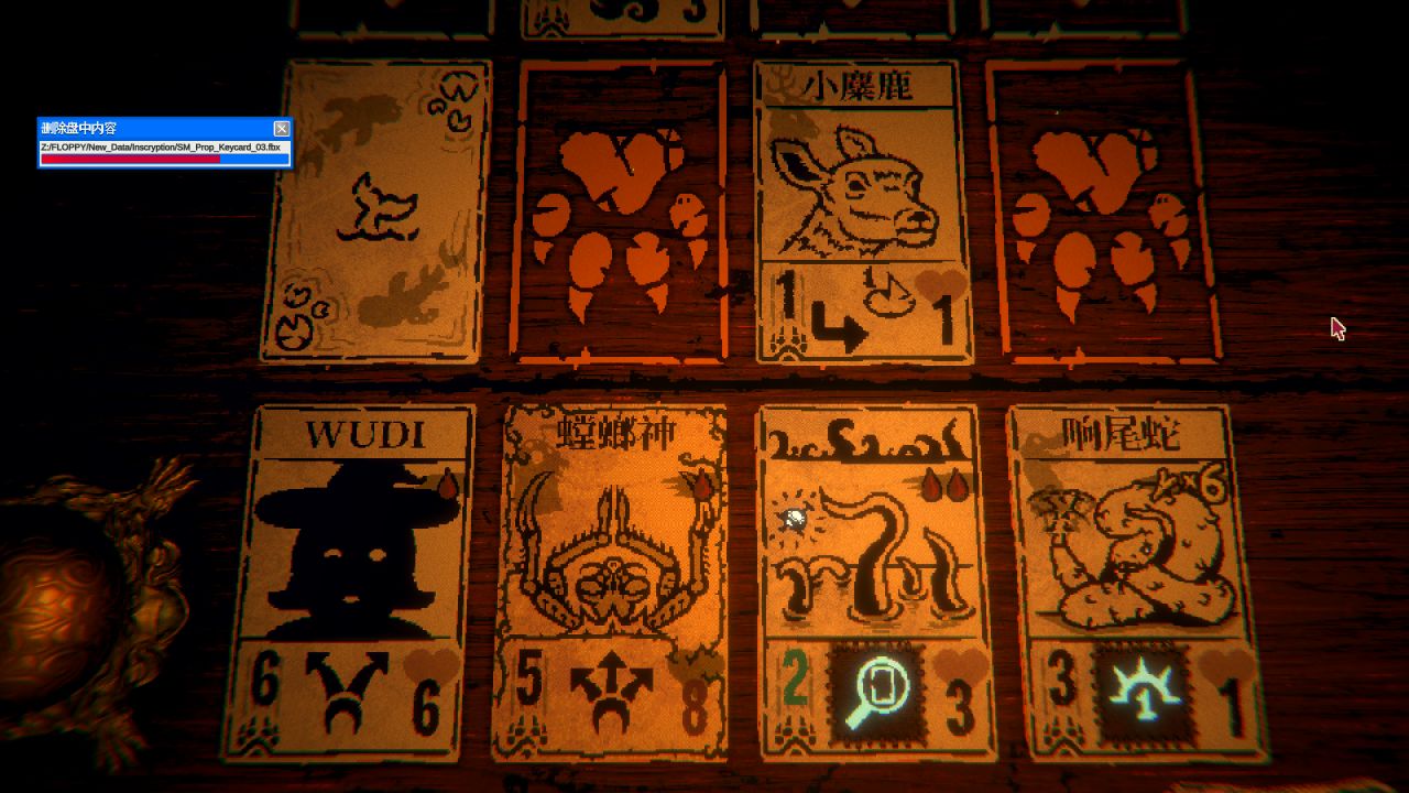 舉個例子,在遊戲中玩家會遇到各種木雕,也就是增強buff,這些木雕分爲頭和身體兩個部分,頭部代表動物類型比如狼和老鼠,身子則是buff類型,比如獻祭後不死,出牌時能夠在牌堆裏進行搜索和打出一張牌後手中獲得相同的牌等等。