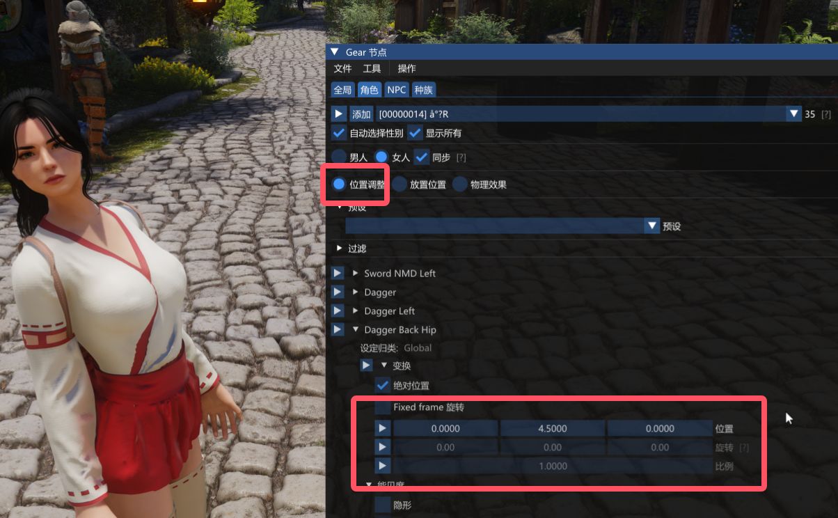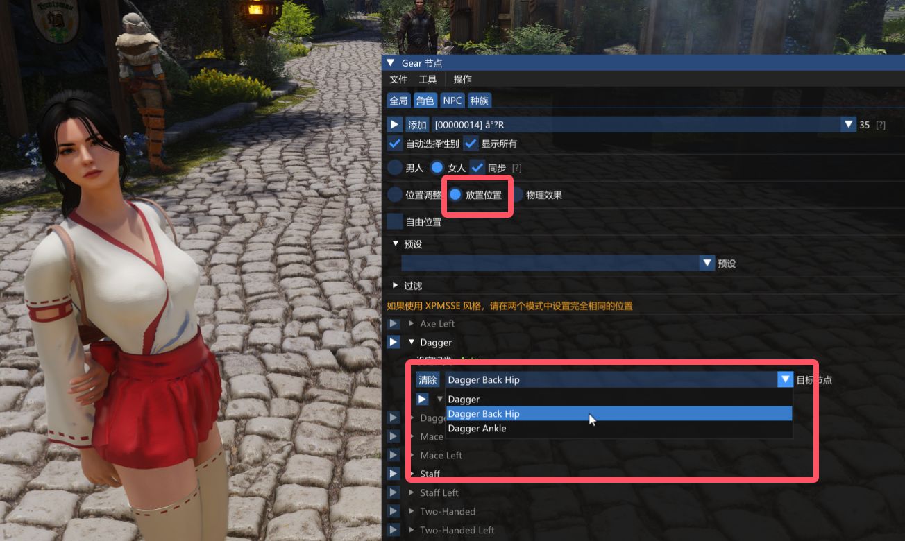 需要在gear節點裏調整,比如可以把匕首放到腳踝上,在放置位置中的目標節點裏選擇: