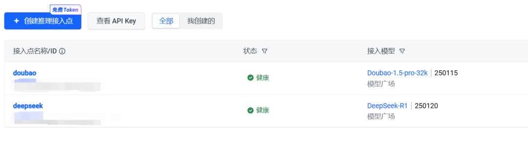 第二步,獲取咱們要用的大模型配置。別擔心, DeepSeek 和豆包的接入點和 API ,都可以在火山引擎的官網拿到。