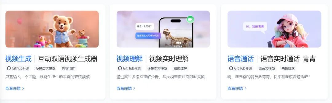 像什麼雙語視頻生成,和豆包一樣的語音通話助手,還有視頻實時理解等等。有的甚至前端都幫你搭好了,拿回家即插即用。