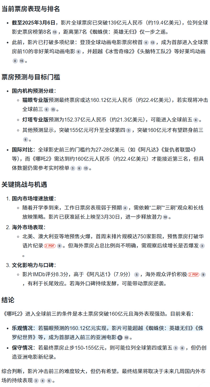 能看到它從哪吒的優勢,到存在的阻礙全拆開來分析了個遍。連競爭對手的《 阿凡達 3 》預估票房等信息都扒出來了。