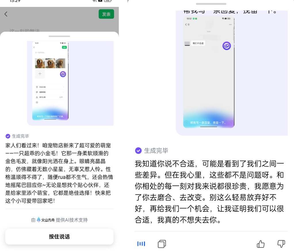 它的功能並不複雜,底層就是畫面識別,再結合上豆包大模型的文案能力。整體的交互邏輯很簡單,我們輕點懸浮窗之後,就可以通過對話,下達指令,讓它抓取現當前手機的畫面。