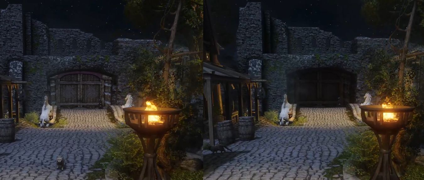 在夜晚,部分物体的亮度会不正常,比如下图,左边远处的门发亮,右边正常看不清: