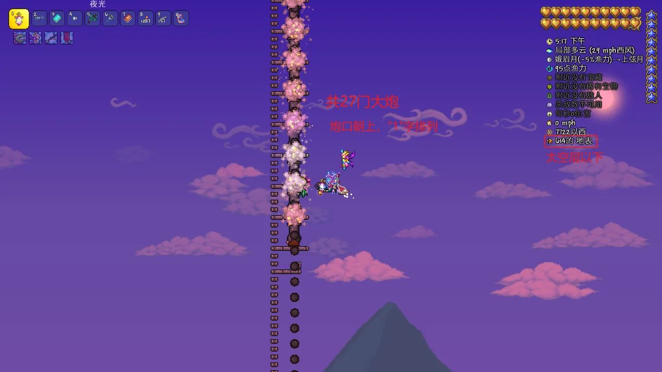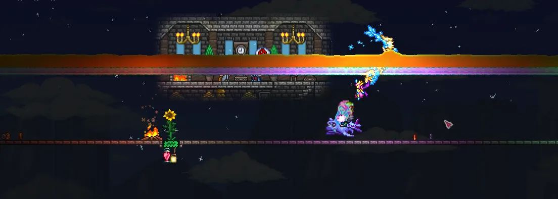 戰前準備:在海邊神聖地的戰鬥平臺的最上面鋪一層足夠長的泡泡(派對女孩售賣,建議700~1000個)做一個泡泡水槽(泡泡可以承載液體但允許人物/物品穿過),使用無底蜂蜜桶在泡泡水槽中灌滿蜂蜜;下面一層平臺每隔一段距離放置可以加Buff的一些物品(篝火/心燈/向日葵等)
