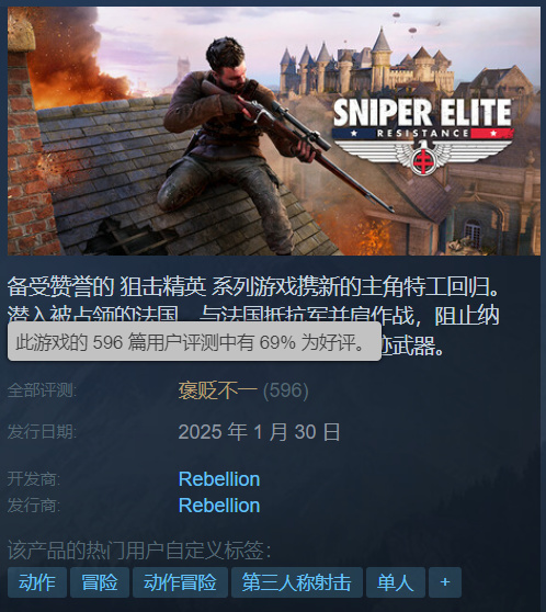 MTC75,Steam好评率68%,2000评价,知名潜行系列《爆单精英》的最新作品,玩法倒没什么太多错误,主要是内容少,看得出制作组把不少精力放到全新的生存动作游戏《原子陨落》上了。