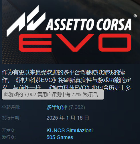 MTC未开分(EA阶段),Steam好评率71%,8000评价,拟真赛车的TOP作品,不过玩家喜提付费测试员。目前国区好评率已经跌至39%,只能说老外包容度是真高……