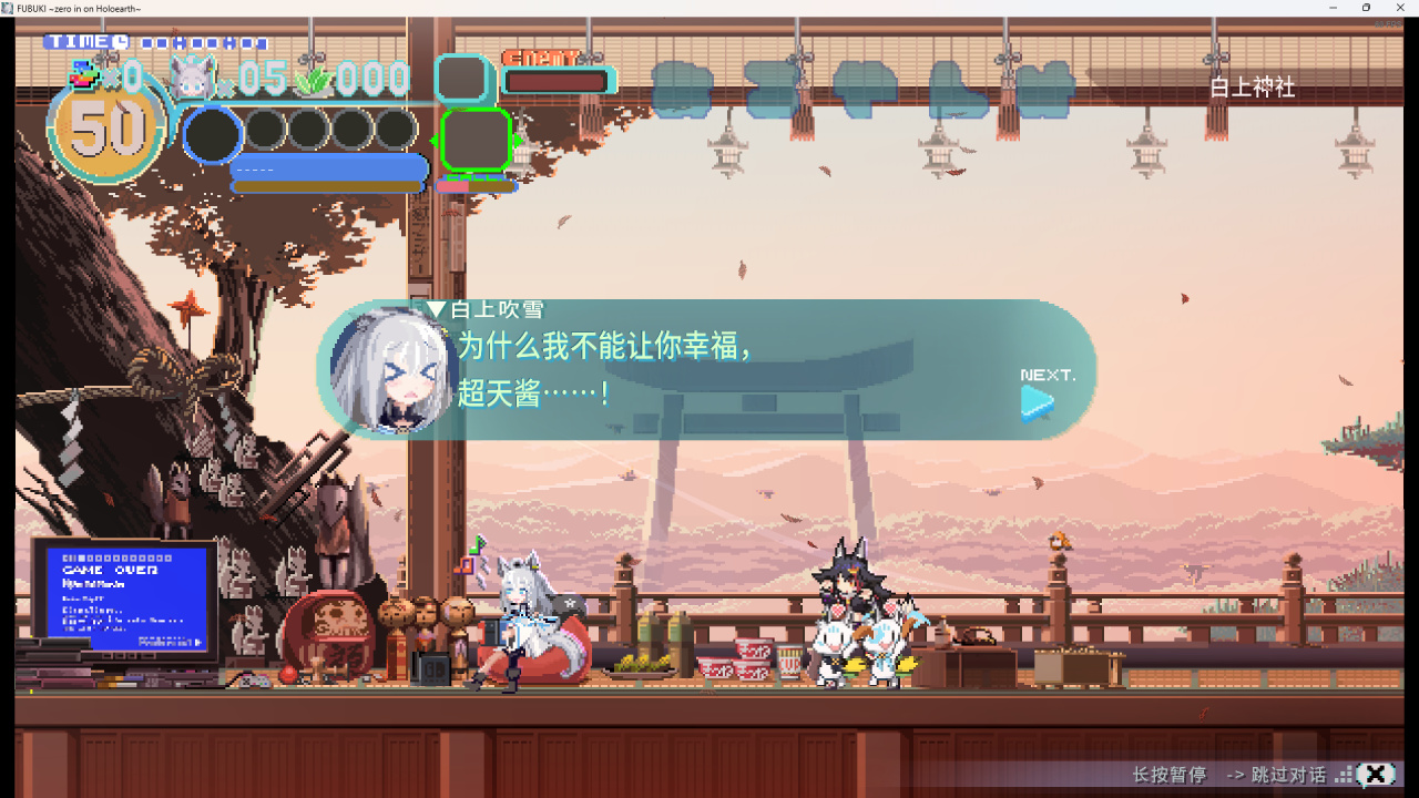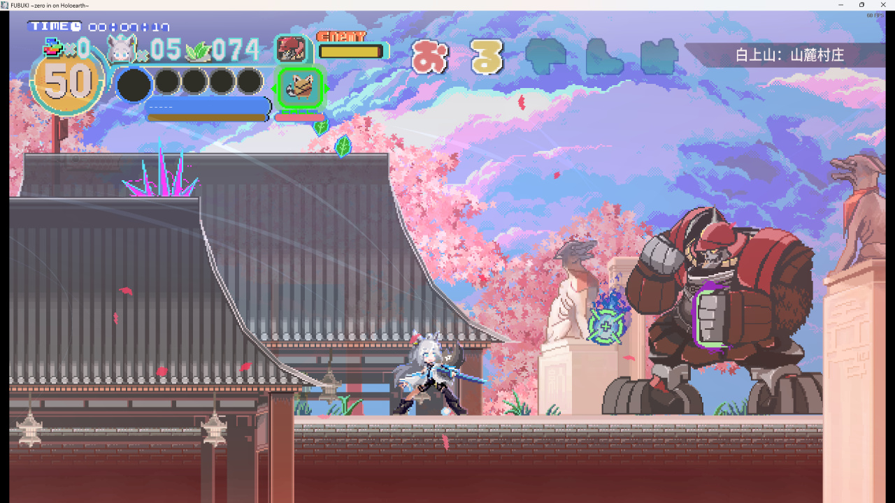 当然,作为一款同人游戏,能有这样的体验,算是额外的惊喜吧,游戏中,玩家将操控白上吹雪,与沿途敌人进行战斗,通过走位、收集等,丰富视觉感观,我想,视觉上的凸现,才是这款游戏独特的魅力之一。