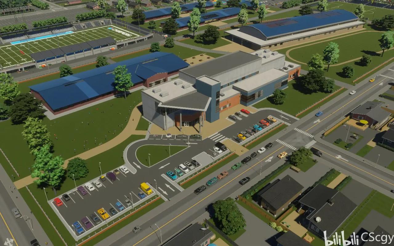 高中也是大平铺地块,适合方正格子城,不过占地面积比较大。