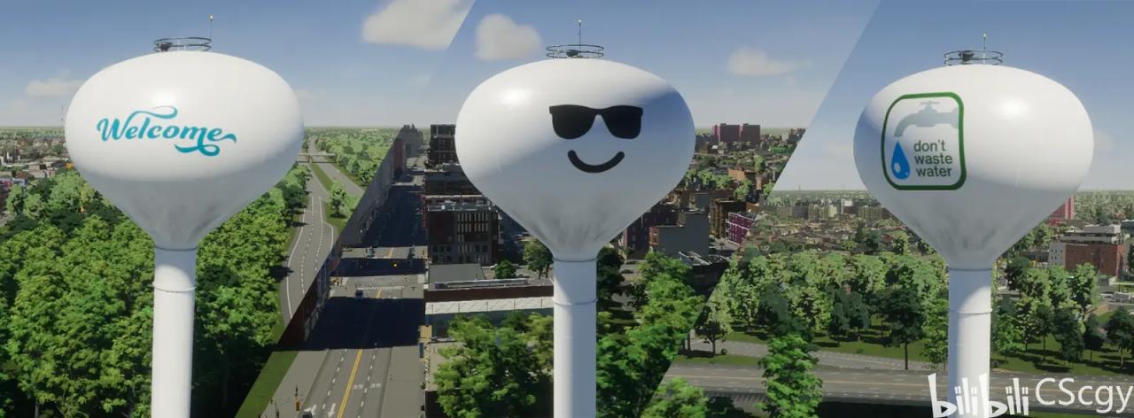 服务建筑:这个水塔挺有意思的,可以有各种不同的贴纸