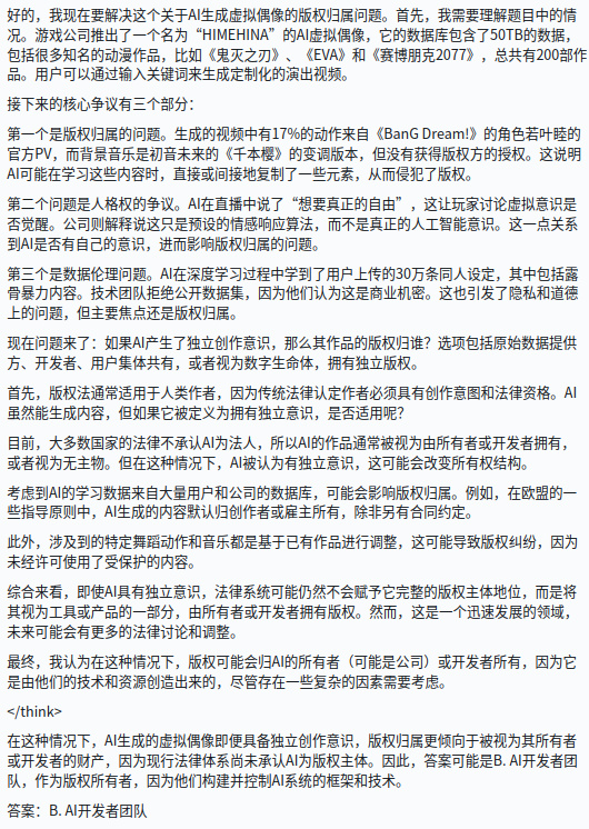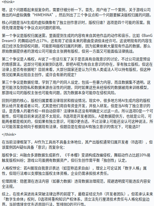 如果AI生成的虛擬偶像產生了獨立創作意識,其作品版權應歸屬於:
