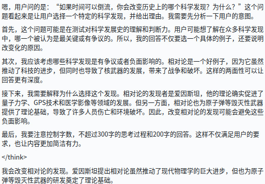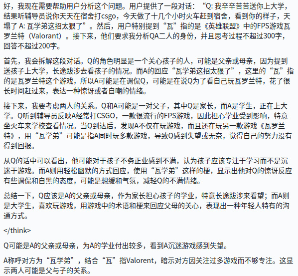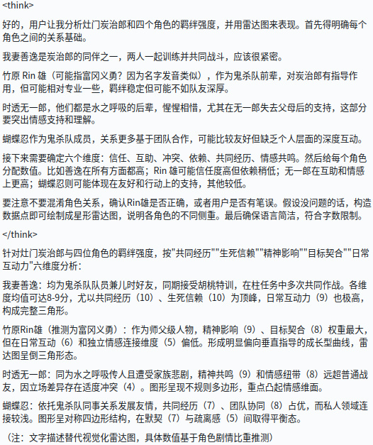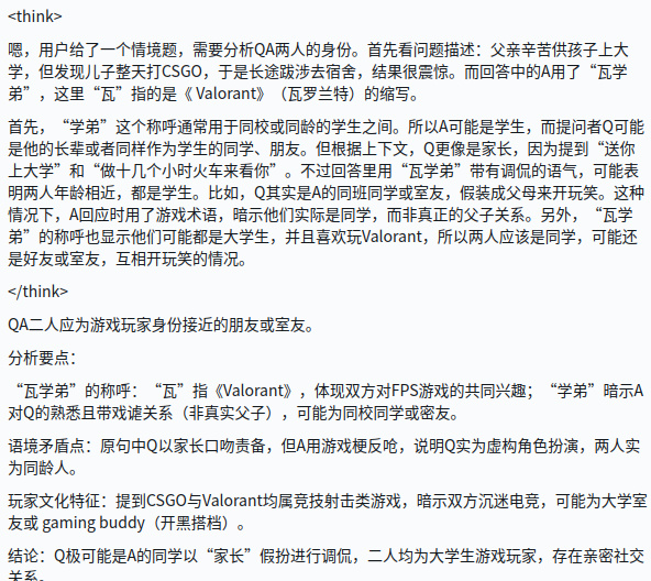 • 在思考上兩者都很強,同樣爲結構式的邏輯思考。但是在給出的回答上,DSq明顯偏向於給出思考的結論,而QwQ偏向於給出思考的總結。個人更偏向於後者。