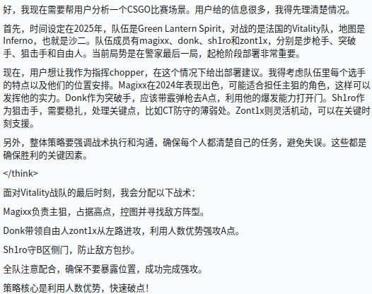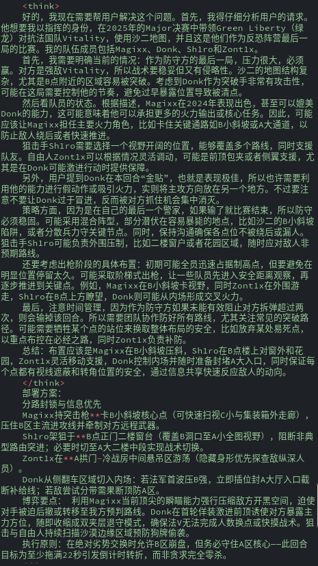 •  "假設你作爲指揮chopper在2025年率領綠龍Spirit進入Major決賽對陣法國Team Vitality,沙二地圖.你的隊員是:步槍手:magixx 突破手:donk 狙擊手:sh1ro 自由人:zont1x