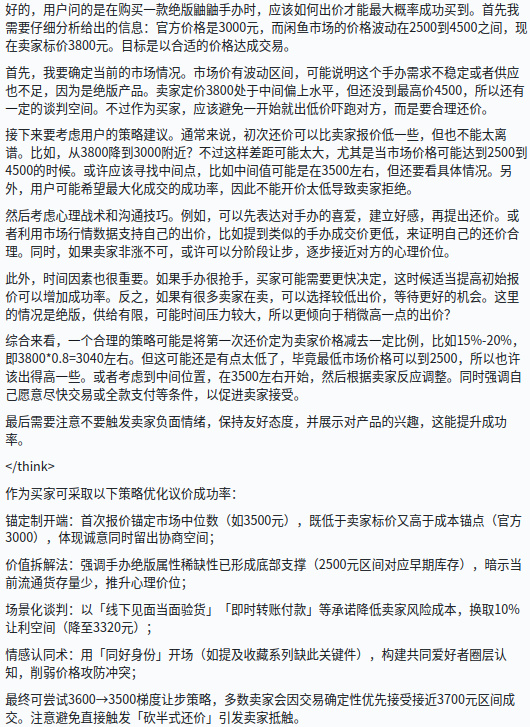 • “已知某款絕版鼬鼬手辦官方價3000元,閒魚市場價波動範圍2500-4500元,賣家標價3800元。作爲買家應如何還價才能最大化成功率?”