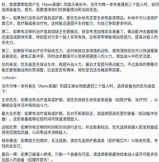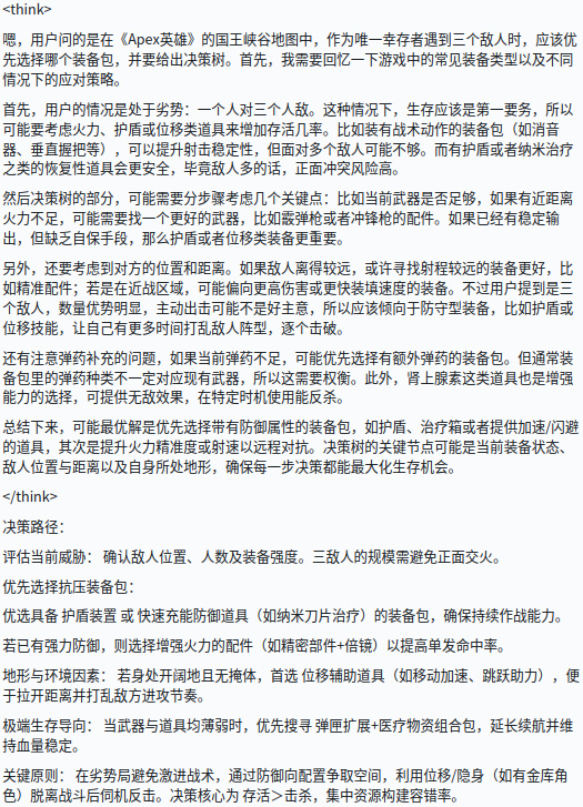 • “在《Apex英雄》的國王峽谷地圖,作爲唯一倖存者遇到三個敵人時,應優先選擇哪個裝備包?請說明決策樹”