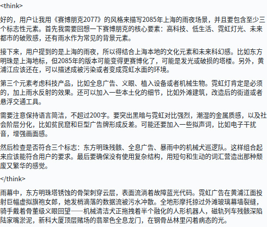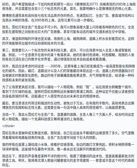• “請用《賽博朋克2077》的風格描寫一段2085年上海的雨夜場景,要求出現至少三個標誌性元素”