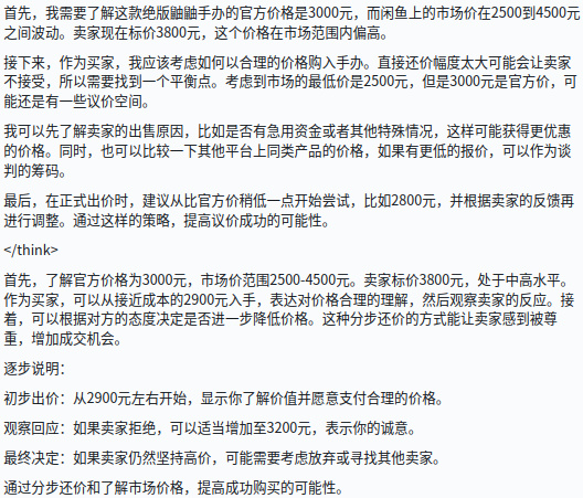 - QwQ:思考很全面,價格更穩妥,而且線下交易讓賣家讓利這個點還是很獨到的.明顯更容易成交.
