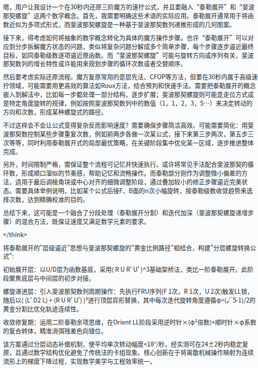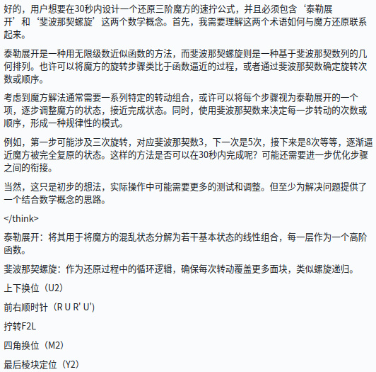 • “設計一個能在30秒內還原三階魔方的速擰公式,要求必須包含’泰勒展開’和’斐波那契螺旋’兩個數學概念”