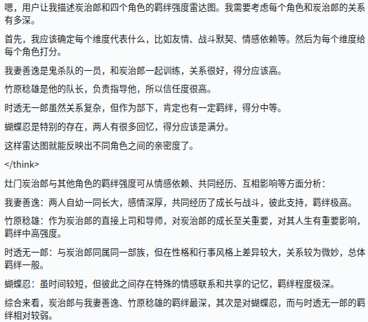 • “描述竈門炭治郎與以下角色的羈絆強度雷達圖: