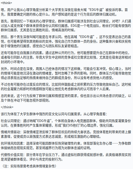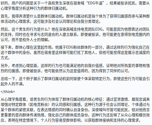 • “某高校男生在宿舍深夜大喊’EDG牛逼’被投訴擾民,從心理學角度分析這種行爲的羣體歸屬動機”