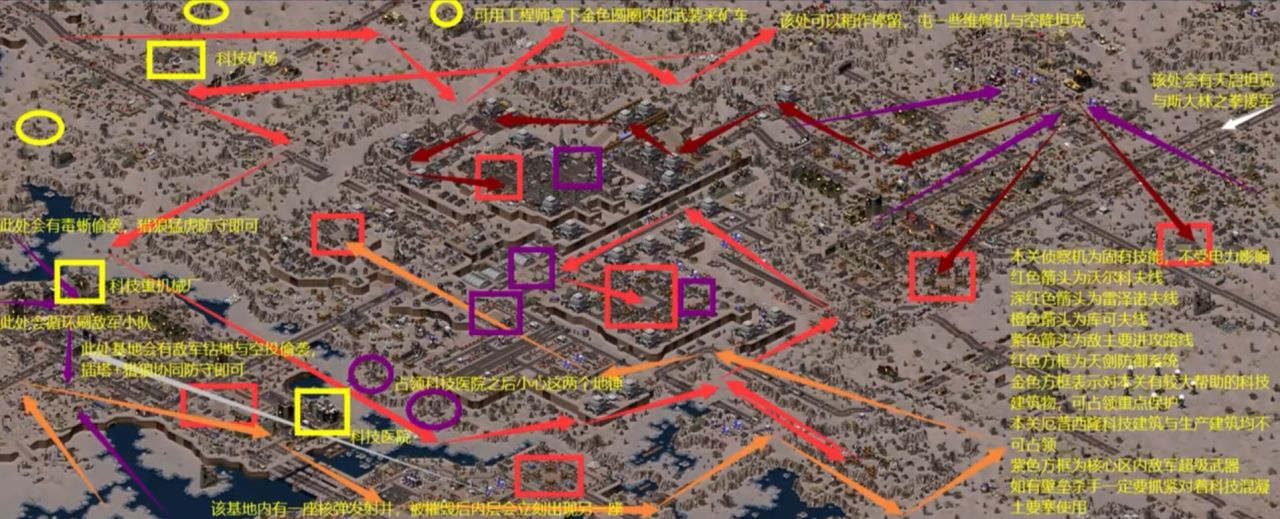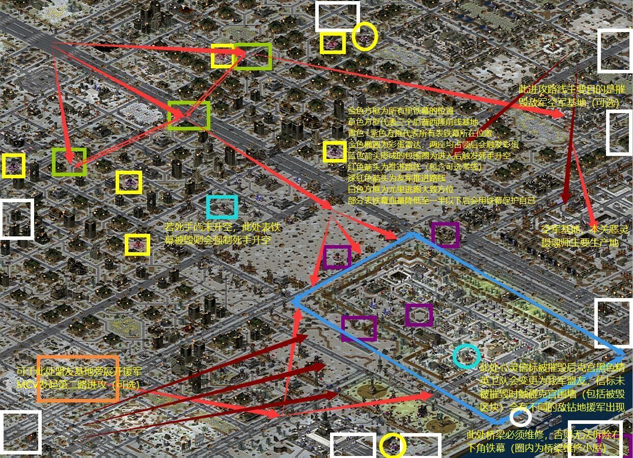 此關正如前面提到的需要玩家三線作戰推進,一路是沃爾科夫和契特卡伊,一路是雷澤諾夫摧毀信標解放的哨站,一路是庫可夫帶領的CN援軍,三條路線相互獨立,都有着只能本路才能摧毀的天劍系統,最後的幾座天劍更是被嚴密防守,周圍的防空力量密不透風,想使用v3火箭遠程打擊或者基洛夫衝進去幾乎不可能,加上有時間限制,被玩家稱爲“大糞衝擊”,我在打的時候也是大汗淋漓,遊戲速度一度開到了最慢。這裏給大家一張流程圖自行體會。
