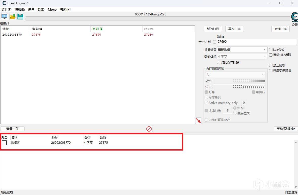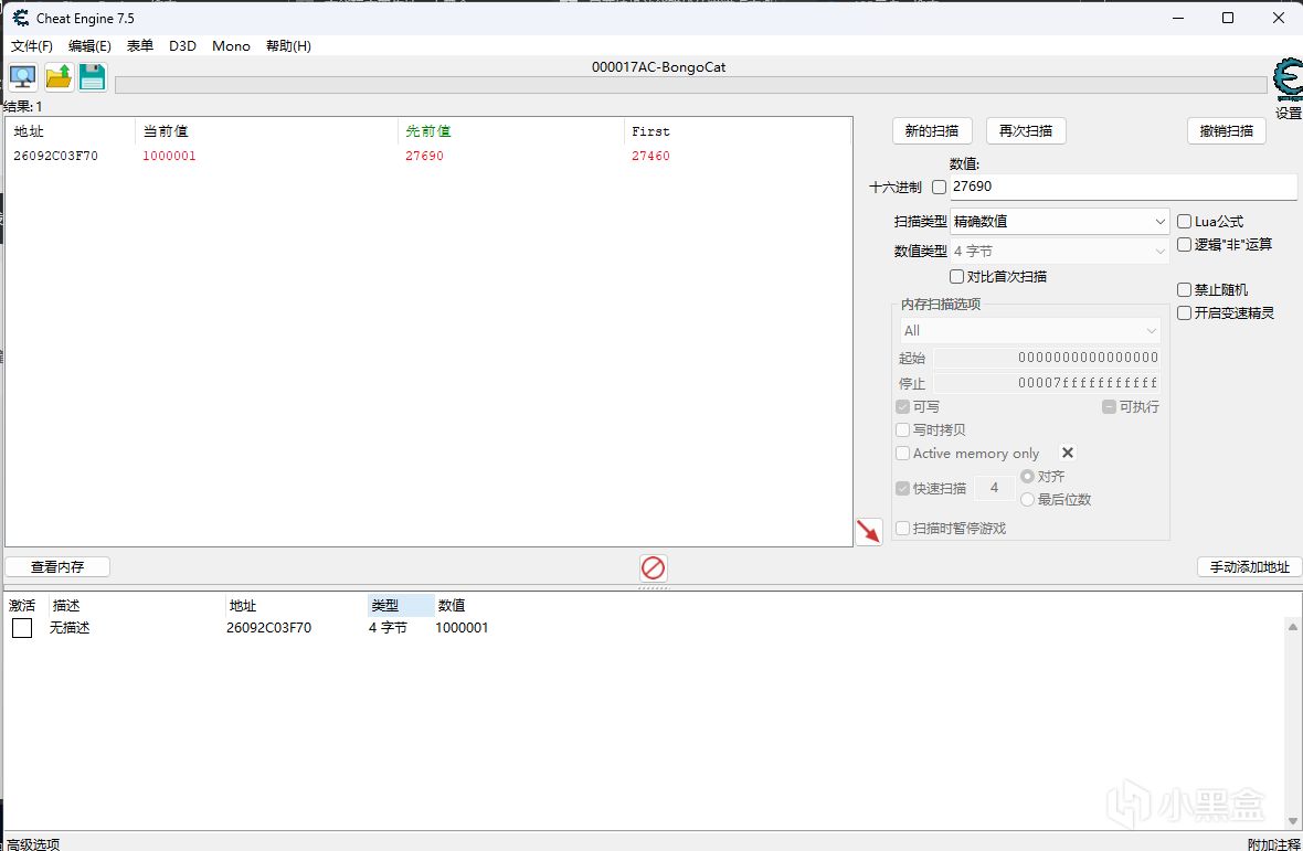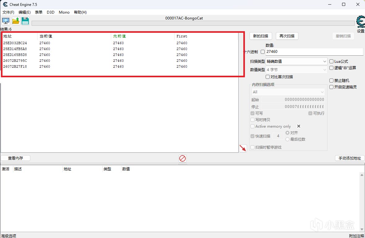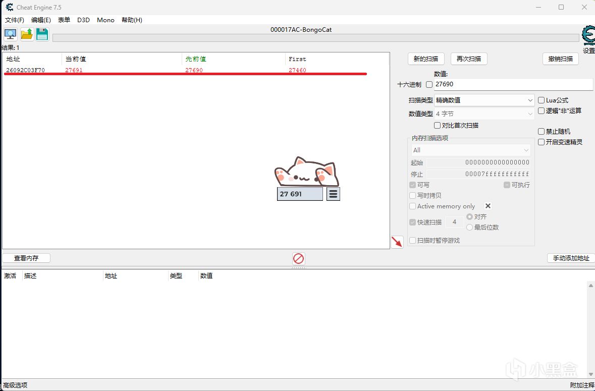 可以看到,這次只顯示 了一個地址 ,我們雙擊它,此時我們在下方雙擊‘數值’來修改數值