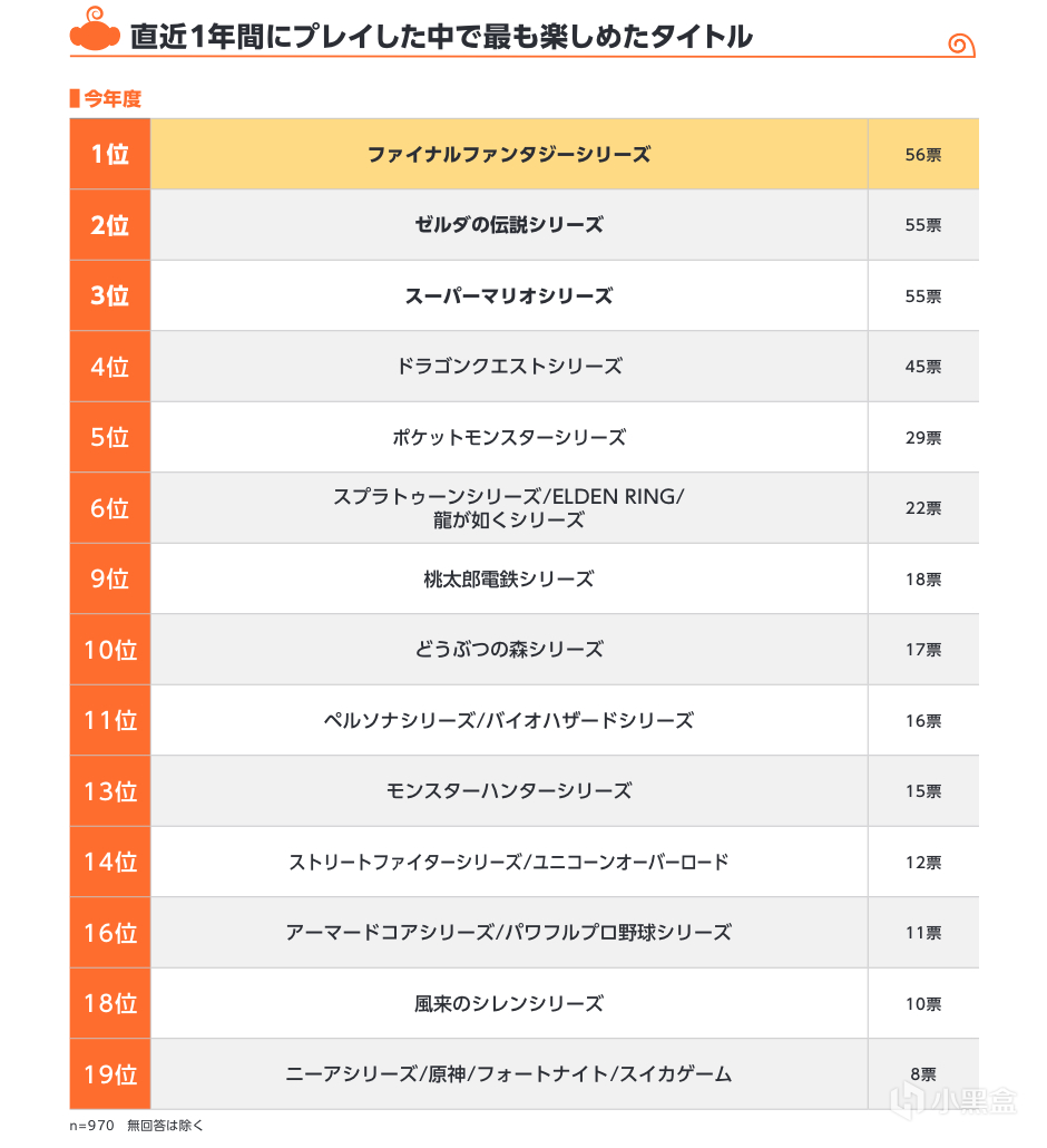 调查中询问了他们“过去一年最喜欢的游戏”,结果显示前20名几乎全部为日本IP,西方游戏鲜有入榜,唯一例外是排名第20的《原神》,而第一款西方作品则是位列第21的《要塞英雄》。