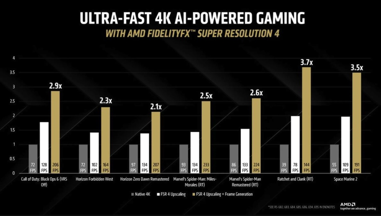 FSR 4相較FSR 3實現大幅飛躍,其圖像質量和幀率優化已大幅逼近NVIDIA的DLSS 4。儘管DLSS 4憑藉Transformer模型仍被視爲超分辨率技術的標杆,但FSR 4的進步已不容小覷,不過,與DLSS 4僅限RTX系列類似,FSR 4也將獨佔RX 9000系列GPU。這意味着老款Radeon用戶無法直接受益,但新卡用戶可在支持FSR 3.1的遊戲(如《使命召喚:黑色行動6》)中無縫升級至FSR 4,享受更高效的性能提升。