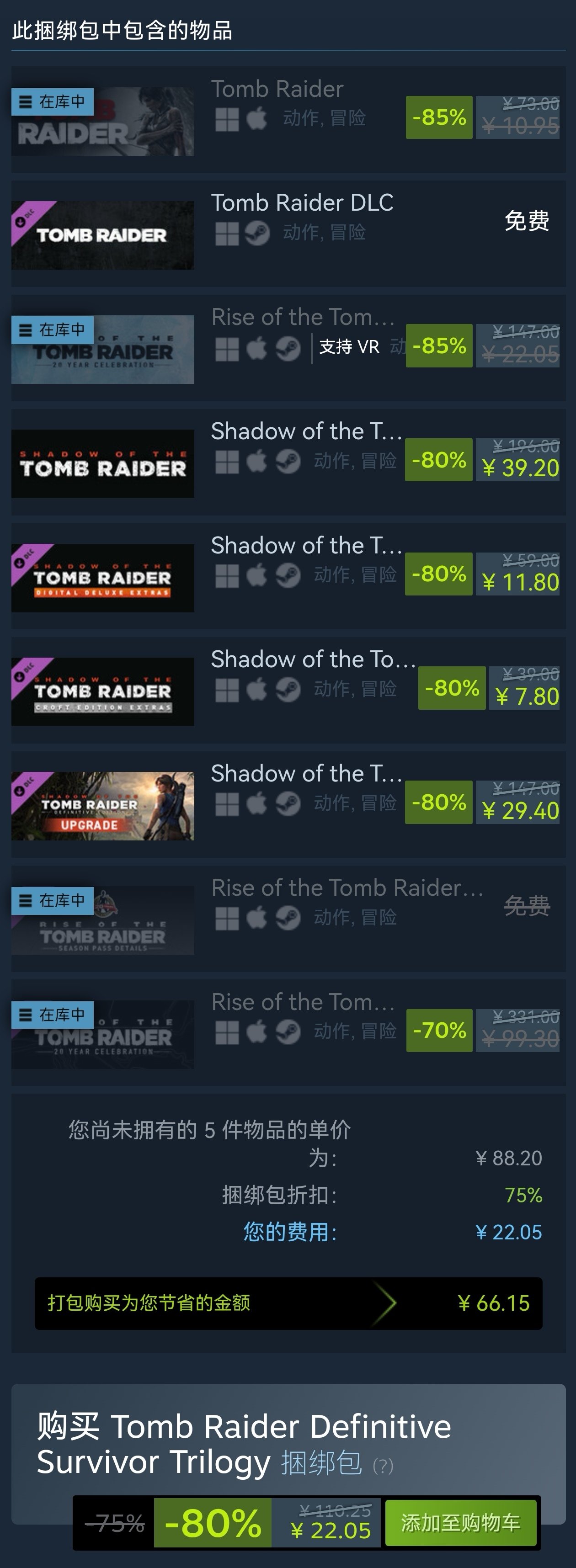 當然遊戲有捆綁包,支持補齊,像我有《古墓麗影9》與《古墓麗影:崛起》了,就能夠用很便宜的價格入《古墓麗影:暗影》。