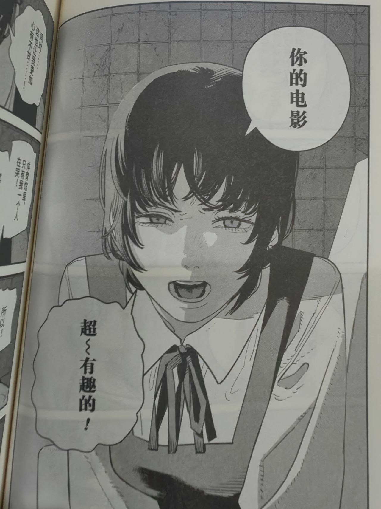 而讓我覺得《再見繪梨》這部作品“神”的原因遠不是悲痛這個“膚淺”的原因,而是“電影感”和充斥其中的“真實與虛構”的荒誕感。有人評價《再見繪梨》時說道:“如果裁掉白邊,把每一頁緊密排列放在一起,就如同呈現出一部完整的電影。”漫畫中運用了大量的模糊畫面來模擬錄像的畫面,也是時時刻刻在提醒讀者我們看的漫畫正是優太拍攝的電影。
