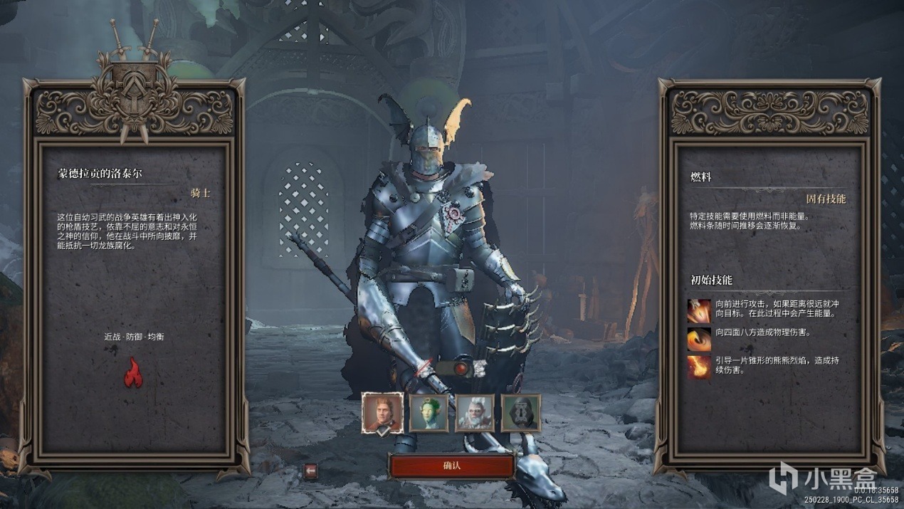 骑士:自幼习武的战争英雄有着出神入化的枪盾技艺,依靠不屈的意志和对永恒之神的信仰,他在战斗中所向披靡,并能抵抗一切龙族腐化。攻击属性火,战斗定位近战、防御、均衡。固有技能——燃料,特定技能需要使用燃料而非能量,燃料条随时间推移会逐渐恢复。